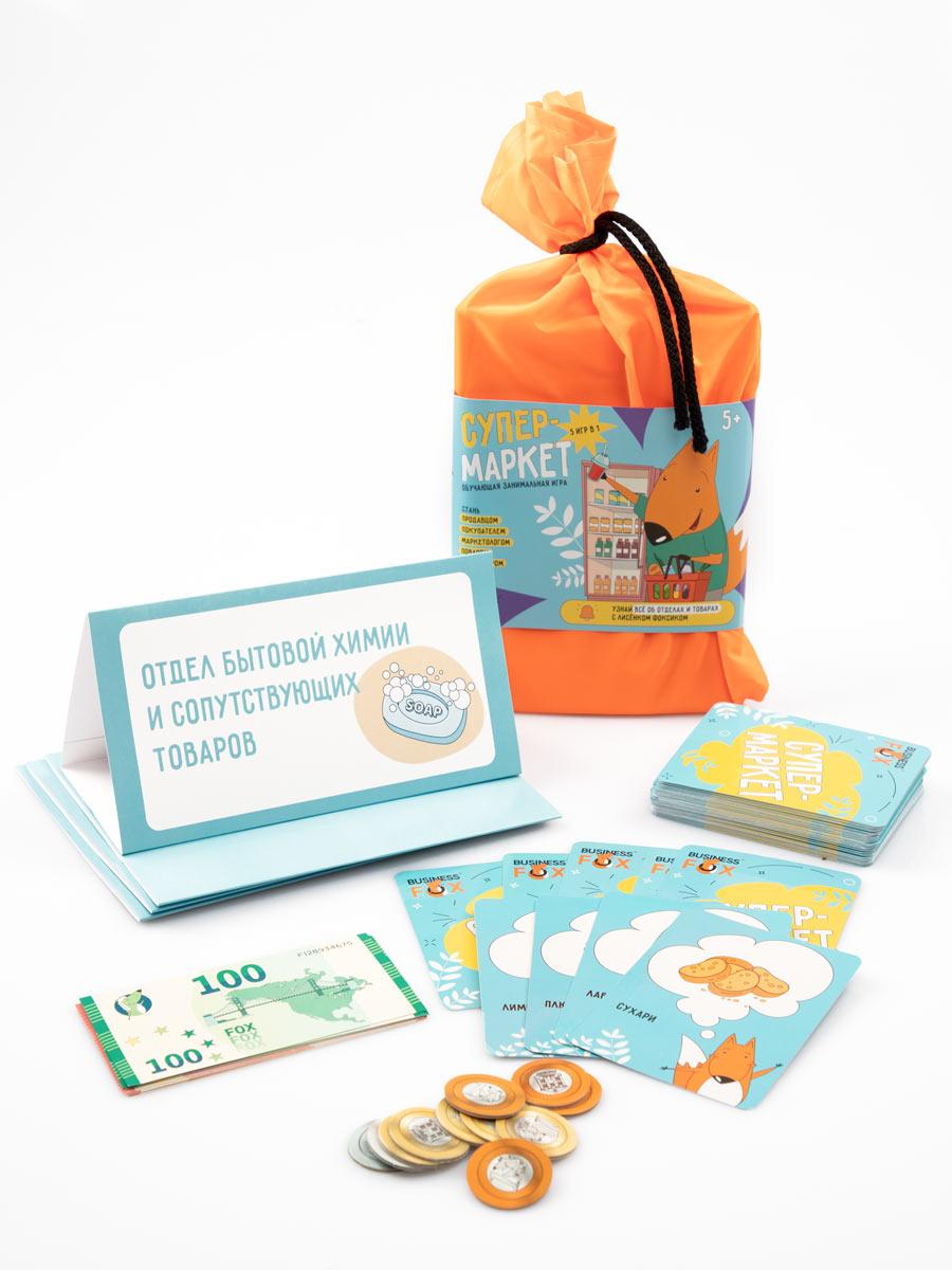 Карточки-продукты – 60 штук Таблички-отделы – 5 штук Размер карточек — 80х105 мм Размер карточек — 190х297 мм Набор «Fox Money» Инструкция – А5 Страна производитель — Россия Бренд — BusinessFox